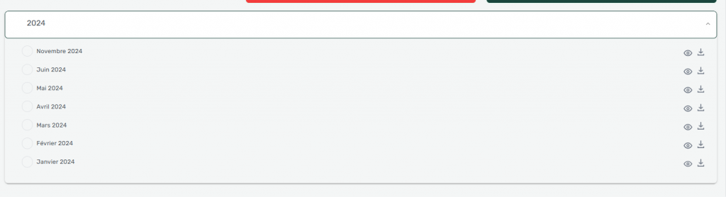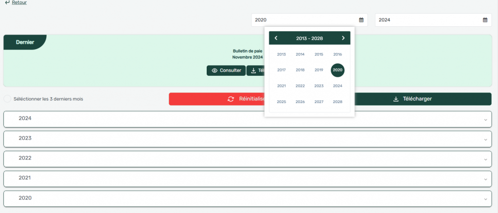 4. Utilisez les filtres pour sélectionner une période spécifique par année, consulter ou télécharger vos documents, ou encore réinitialiser le filtre.
