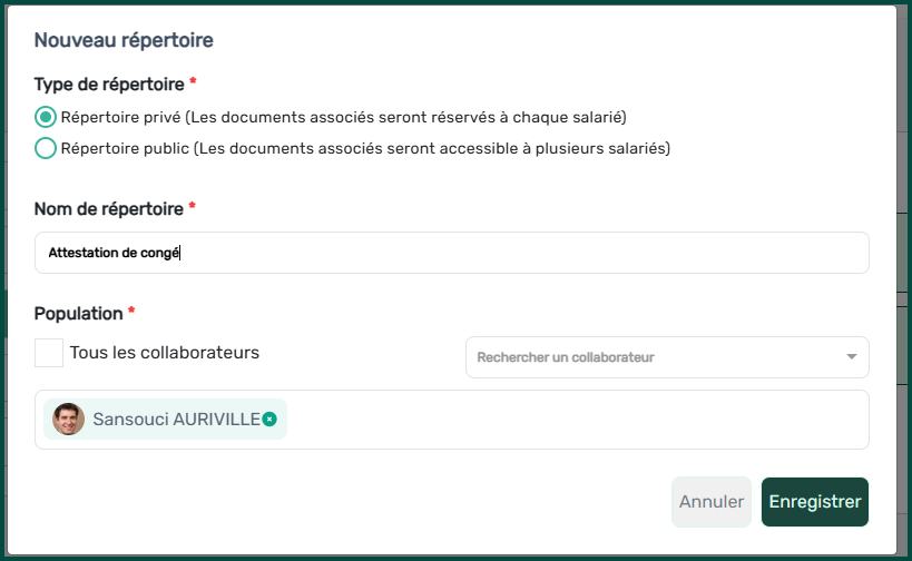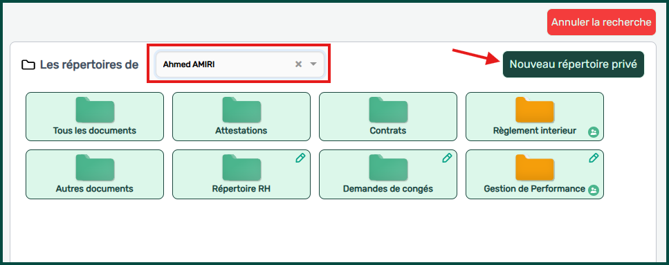 Créer pour ce collaborateur un répertoire privé dédié en cliquant sur « Nouveau répertoire privé »