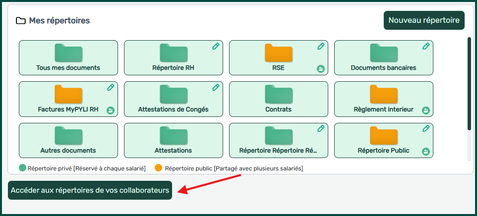 Les managers et administrateurs peuvent accéder aux répertoires des collaborateurs pour suivre ou gérer leurs documents.