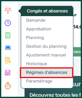 1- Depuis le menu Congés et absences, cliquez sur Régimes d’absences.