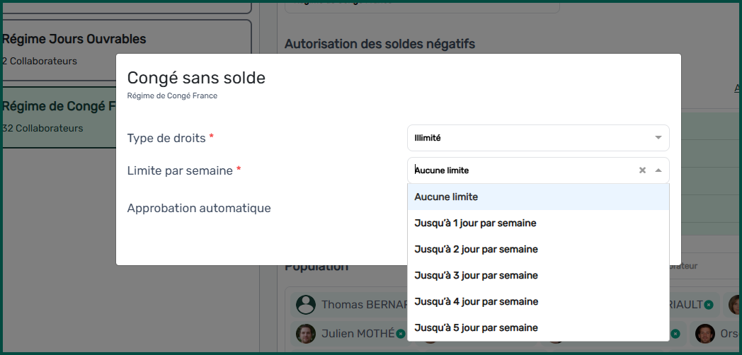 Limite par semaine : fixe une limite éventuelle sur le nombre de jours consécutifs pris (ex. : aucune limite, jusqu'a 1 ou 2 jours ).