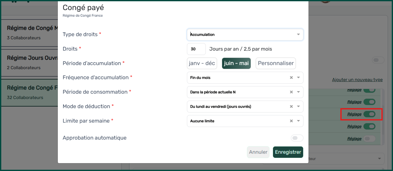 Approbation automatique : activez cette option si vous souhaitez que les demandes soient automatiquement validées.